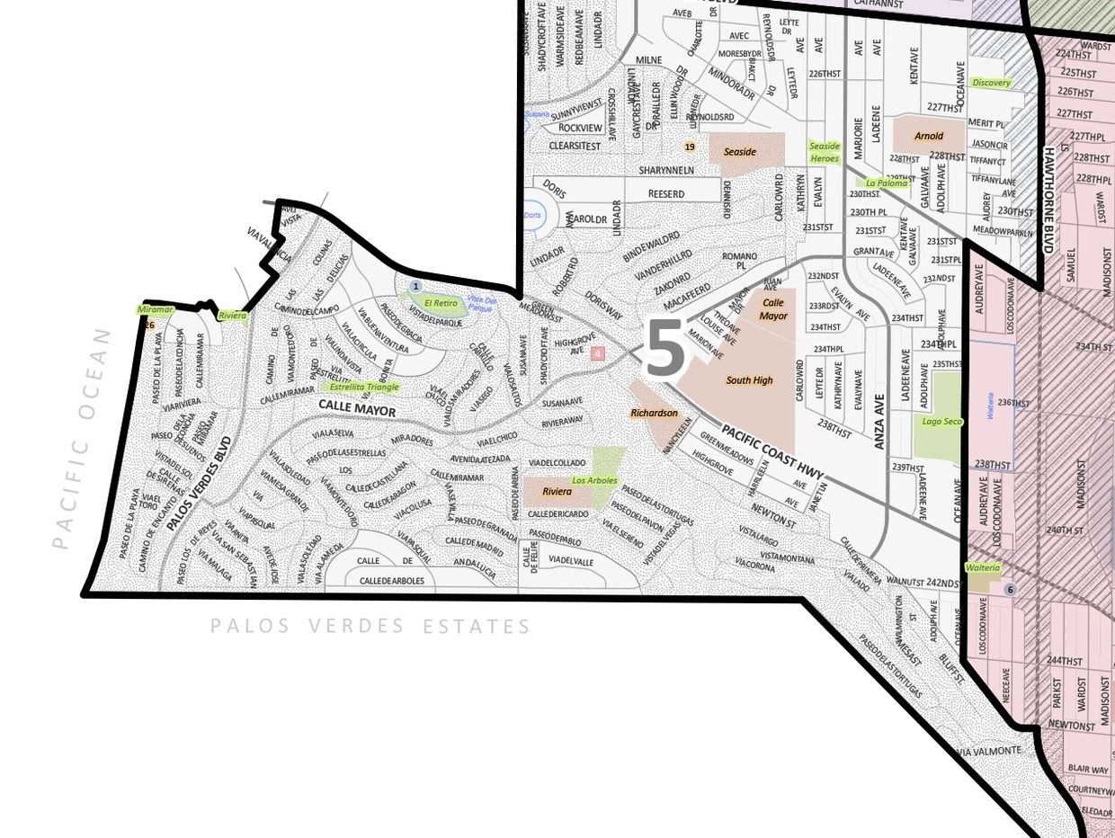 District 5 contains the Hollywood Riviera and South Torrance. The northern boundary is Sepulveda Blvd. The eastern boundary is Hawthorne Blvd and Ocean Blvd. The western boundary is Riviera Village and the Pacific Ocean. The southern boundary is the City of Palos Verdes Estates.